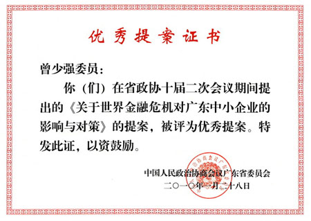 曾少强委员针对国际金融危机冲击我省中小企业的内外因素,紧扣当前我省经济发展的重要问题,在政协第十届广东省委员会第二次会议上提交了《关于世界金融危机对广东中小企业的影响与对策》的提案。